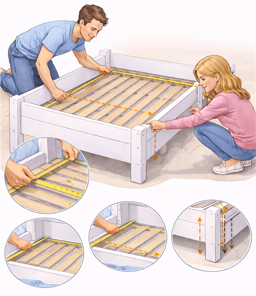 4). Определяя высоту, рулетку закрепляют за основание кровати и растягивают до верхнего края борта.