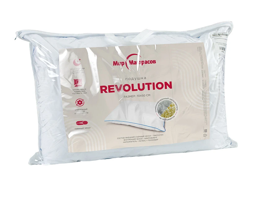 Revolution — недорогая ортопедическая подушка для детей от 7 до 18 лет. Она обладает низкой степенью жесткости, хорошо поддерживает голову и шею, помогает улучшить мозговое кровообращение, что положительно влияет на работу головного мозга школьника.