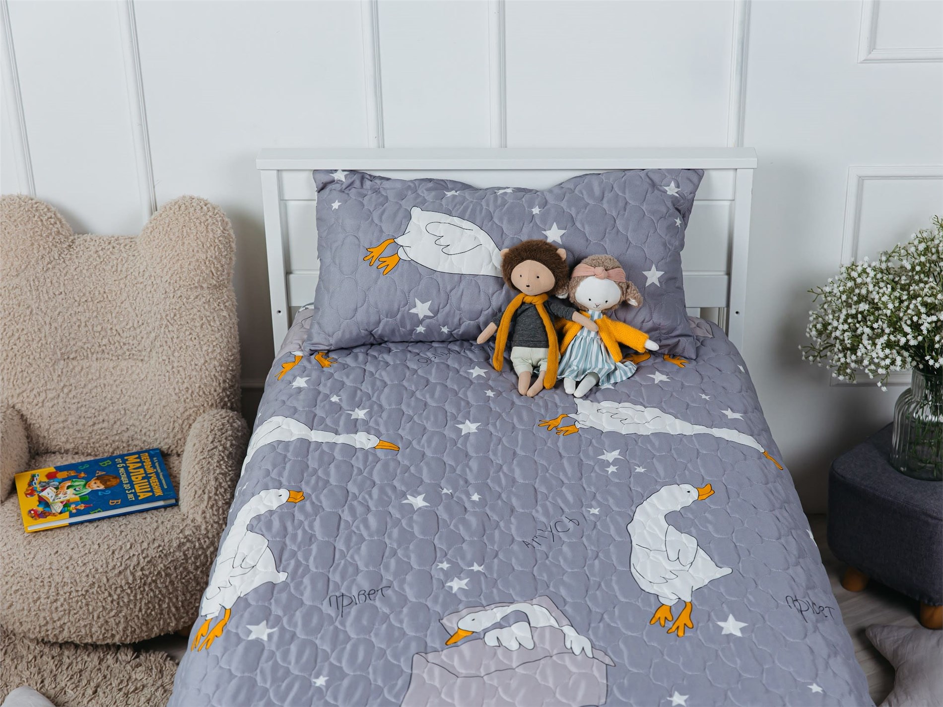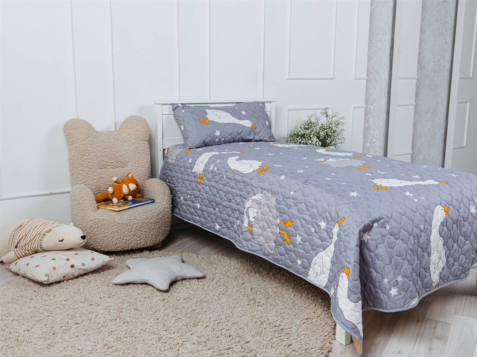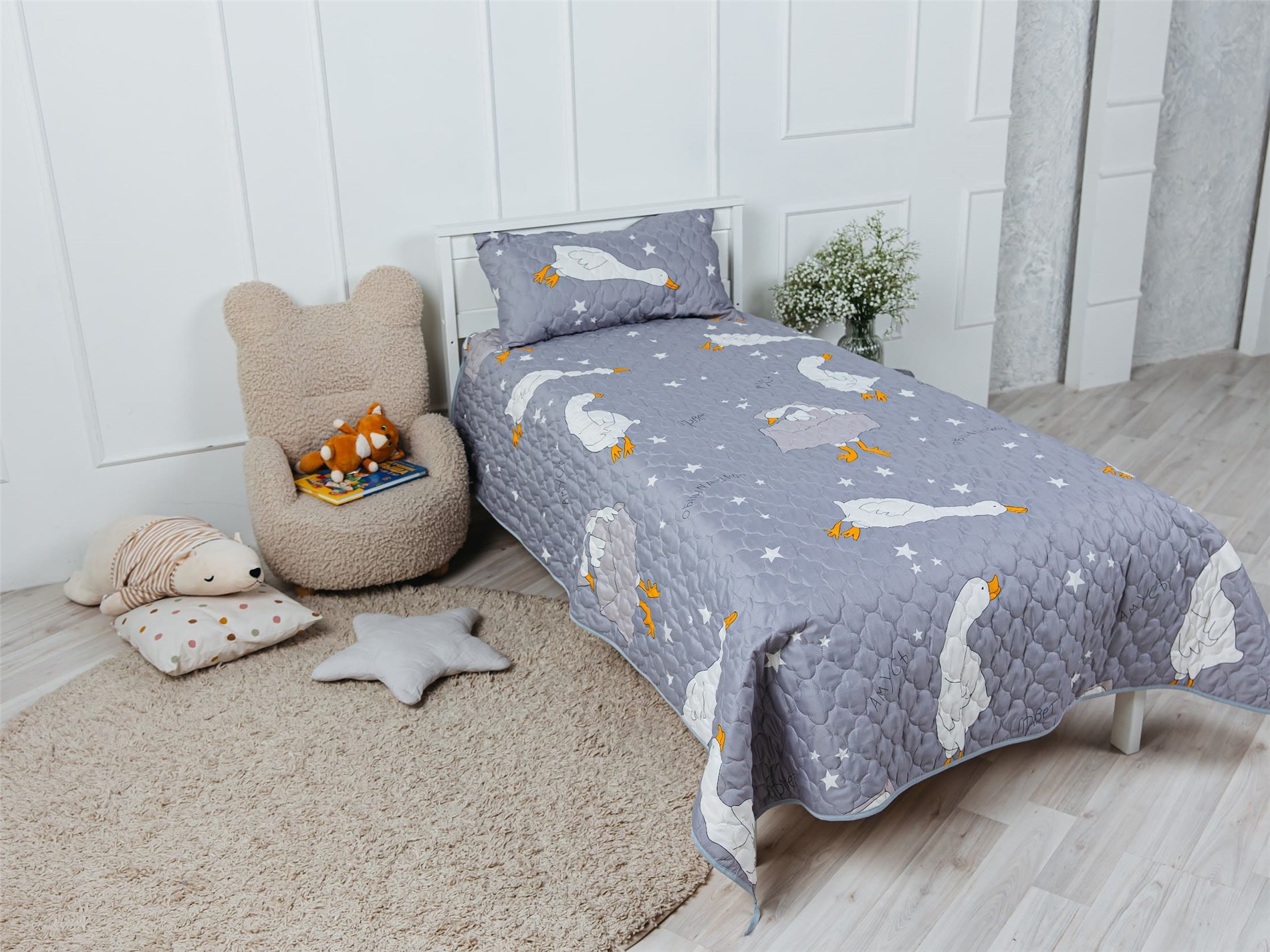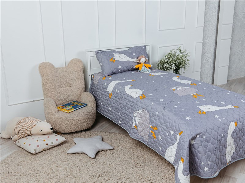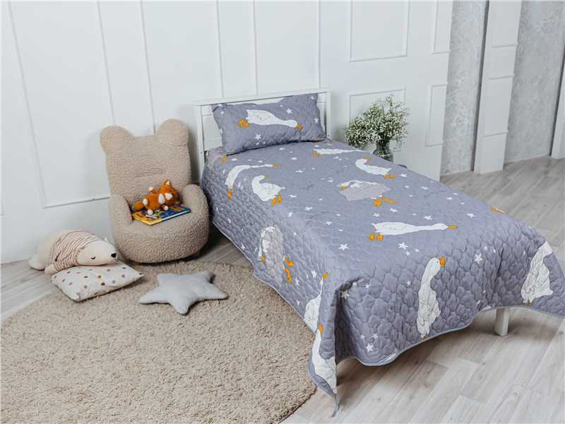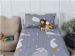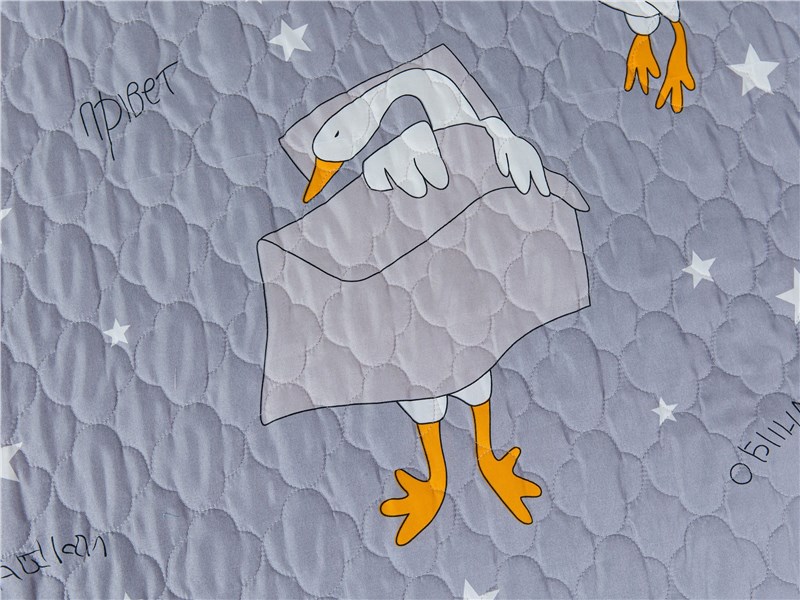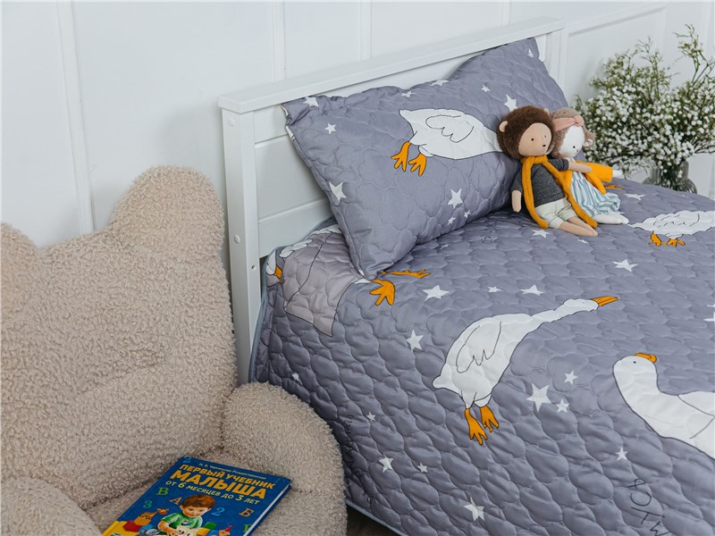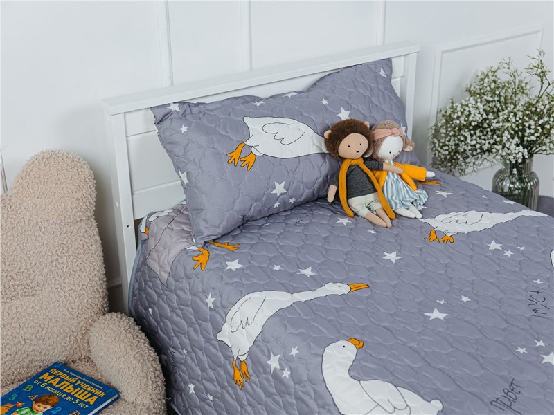 Покрывало Goose превращает детскую комнату в настоящий уголок сказки. На нежном сером фоне, словно на вечернем небе, парят весёлые белые гуси с яркими оранжевыми лапками и клювами. Между ними сияют маленькие звёздочки, создавая атмосферу ночного волшебства. Стеганая поверхность придаёт покрывалу объём и мягкость, делая его невероятно уютным и приятным на ощупь.