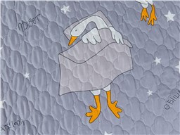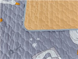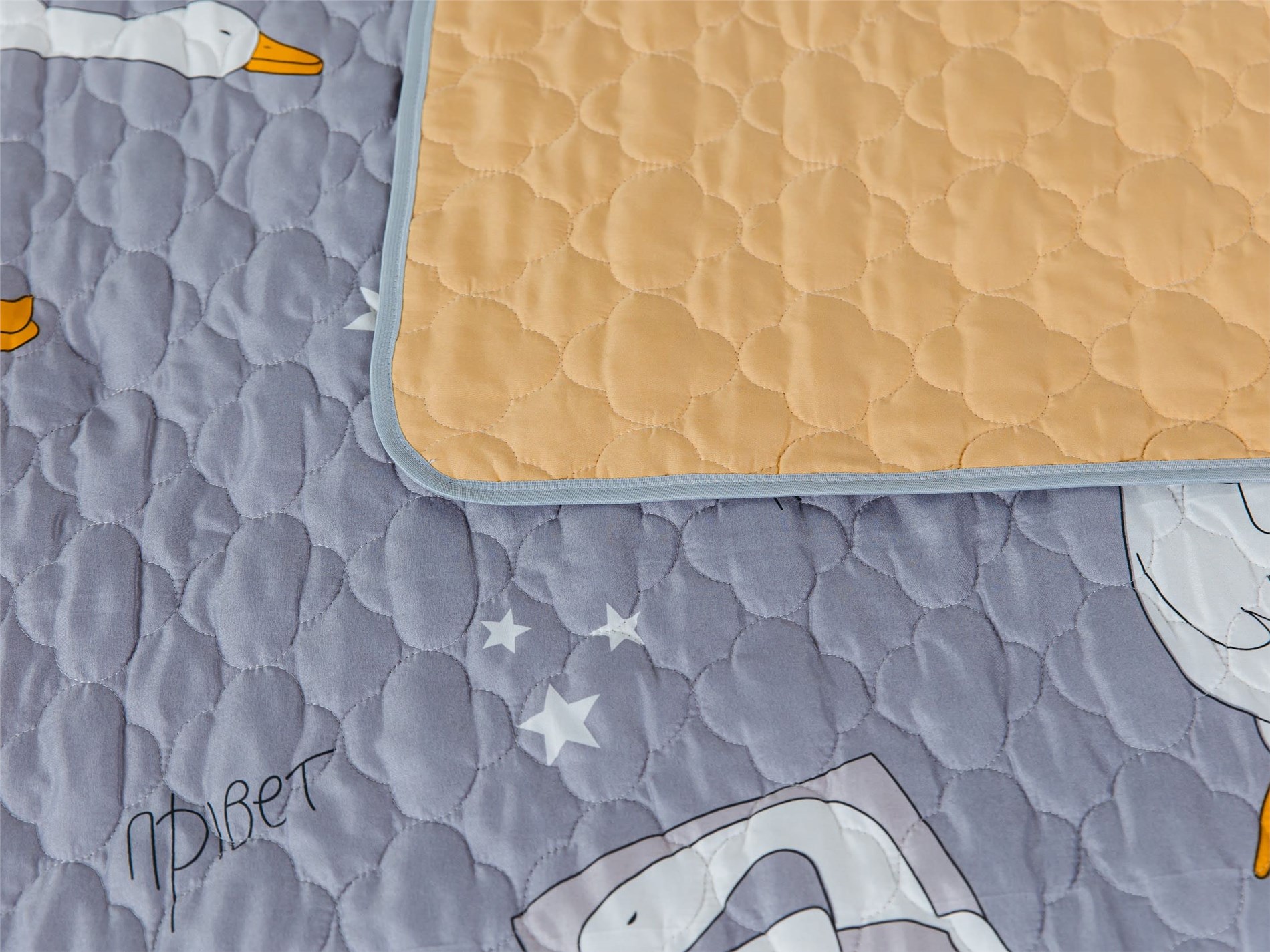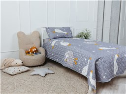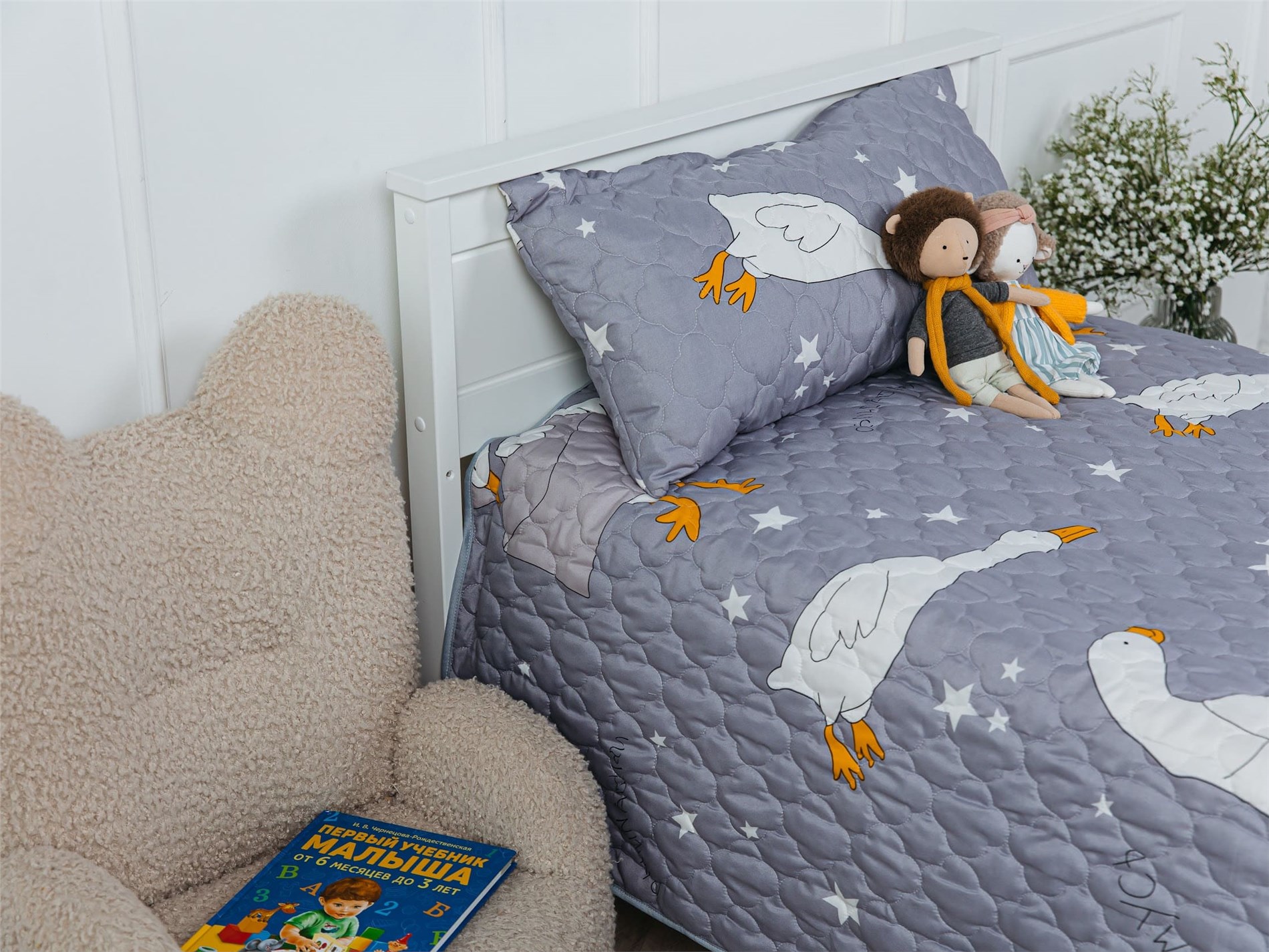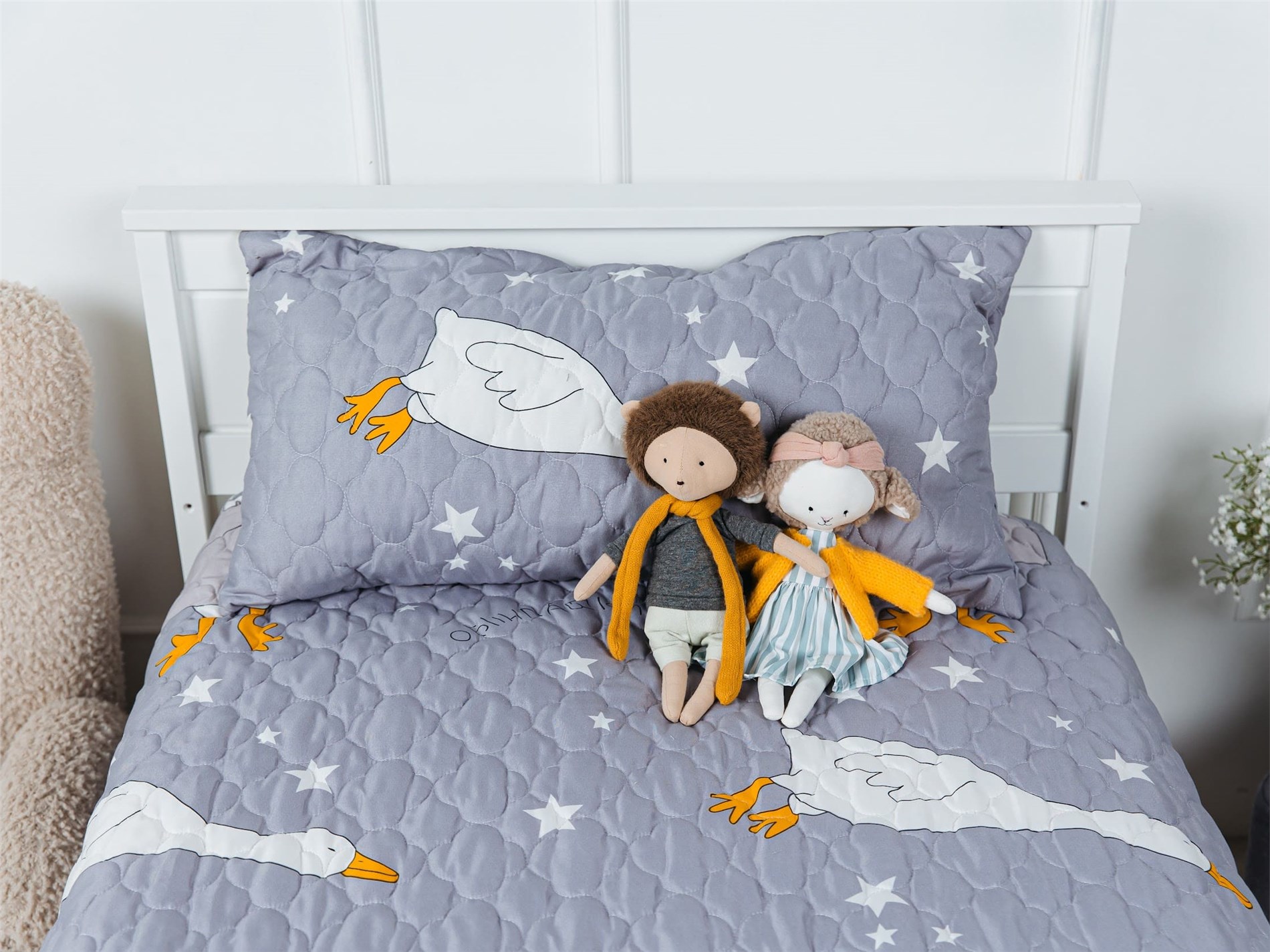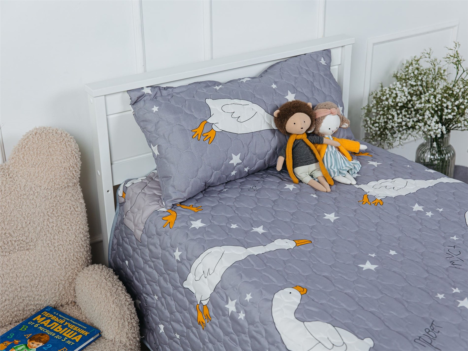 Покрывало Goose превращает детскую комнату в настоящий уголок сказки. На нежном сером фоне, словно на вечернем небе, парят весёлые белые гуси с яркими оранжевыми лапками и клювами. Между ними сияют маленькие звёздочки, создавая атмосферу ночного волшебства. Стеганая поверхность придаёт покрывалу объём и мягкость, делая его невероятно уютным и приятным на ощупь.