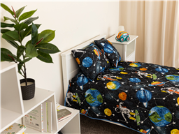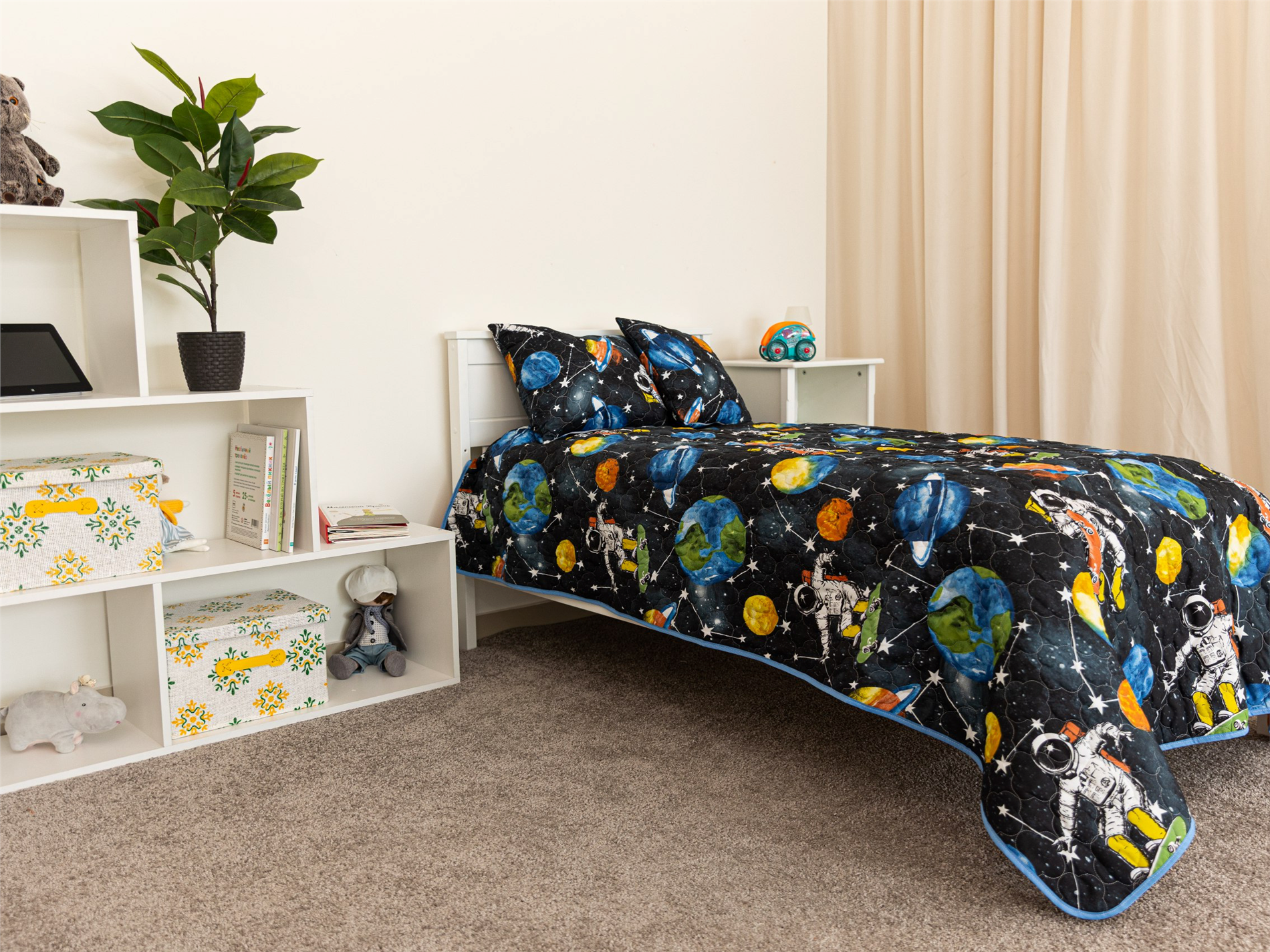 Покрывало с ярким космическим принтом создаёт настроение в детской комнате и делает кровать аккуратной за секунды. Ткань приятная на ощупь, не скользит и отлично держит форму, поэтому покрывало выглядит аккуратно даже при активном использовании.