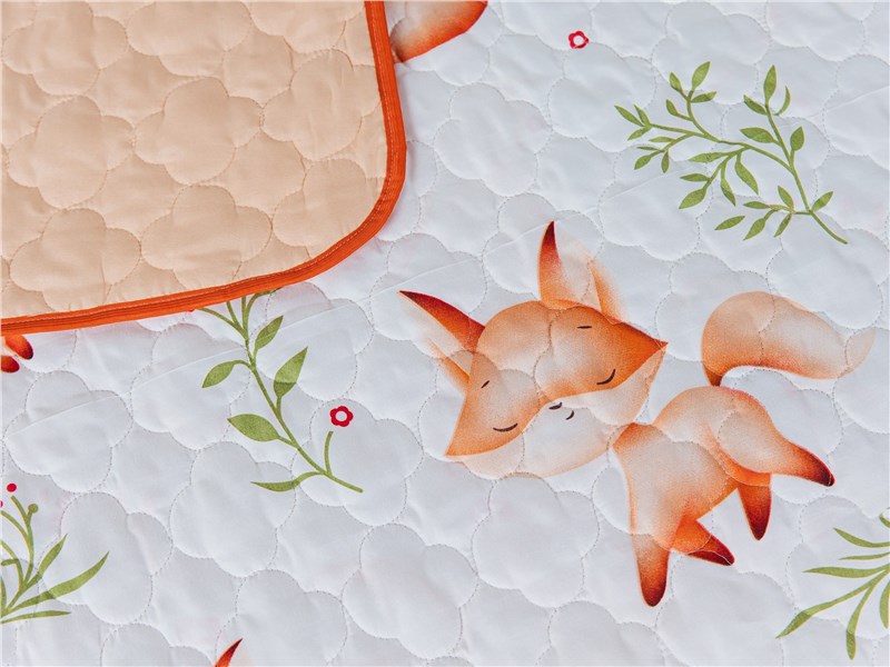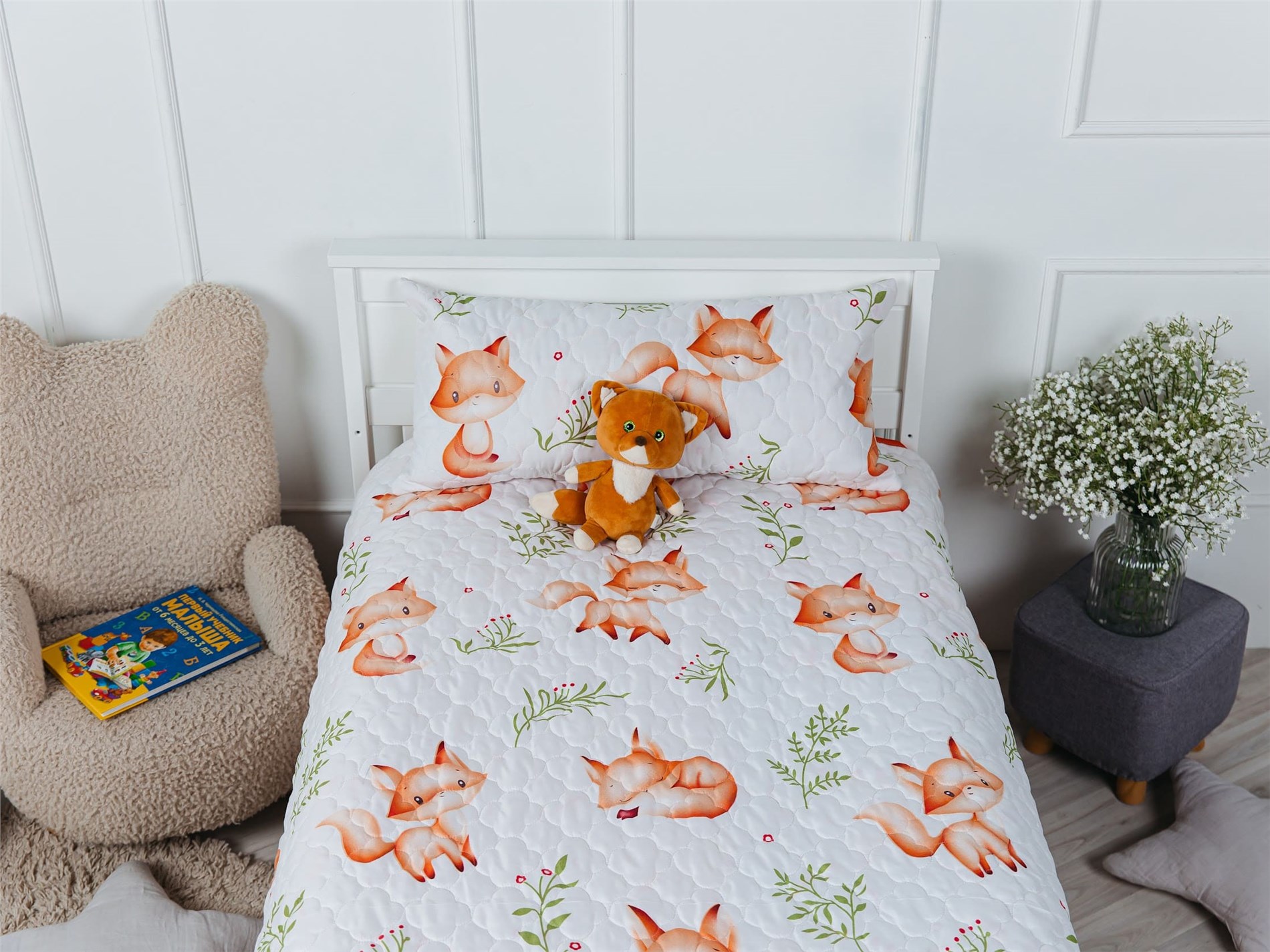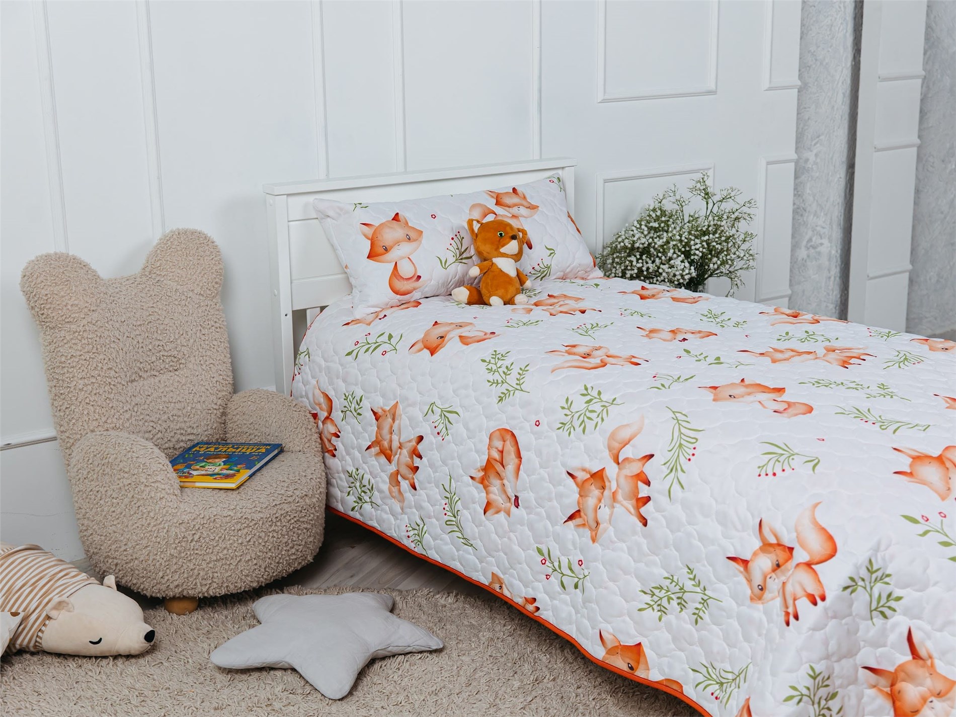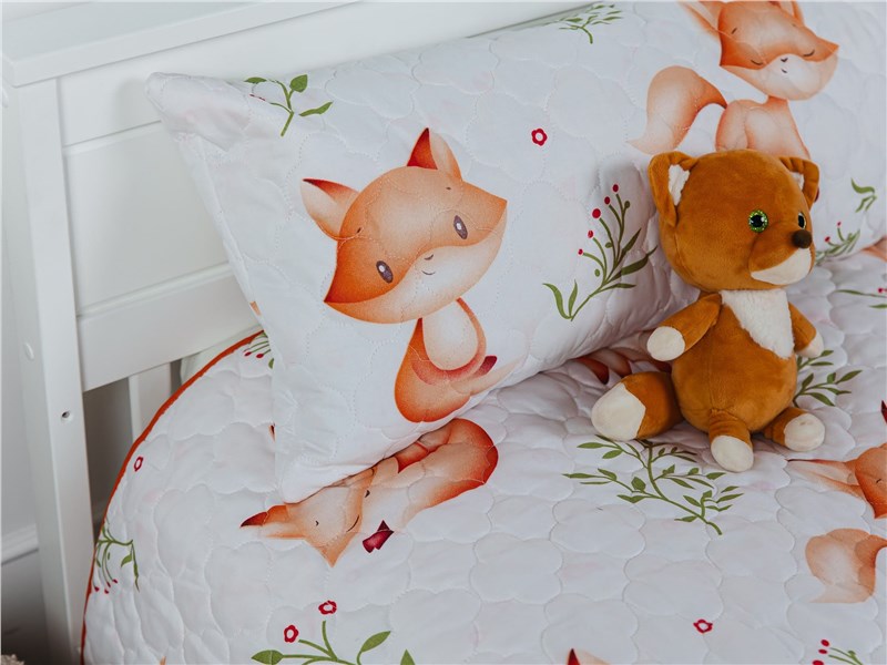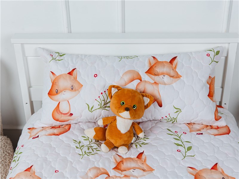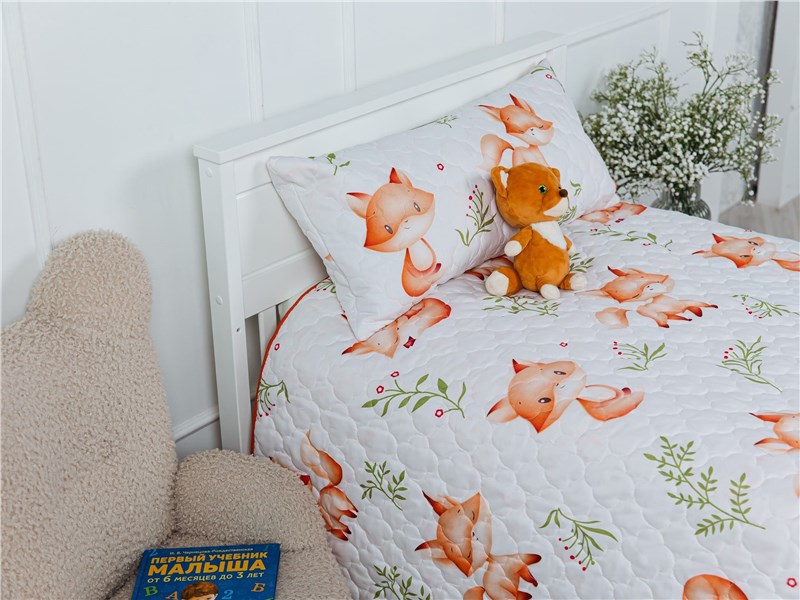 Подарите спальне вашего малыша атмосферу уюта и волшебства с покрывалом Dreamy Foxes. Белоснежный фон украшен милыми рыжими лисичками в разных позах — они играют, улыбаются и сладко спят, словно охраняют детские сны. Яркие акценты зелёных веточек и красных ягод добавляют живости и свежести, создавая эффект настоящей сказки в комнате.