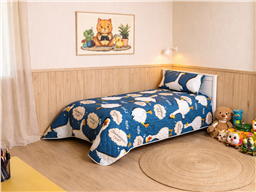 Насыщенный глубокий оттенок синего создаёт ощущение уюта и защищённости, а весёлый принт добавляет комнате настроения, игры и лёгкой озорной атмосферы.