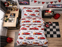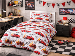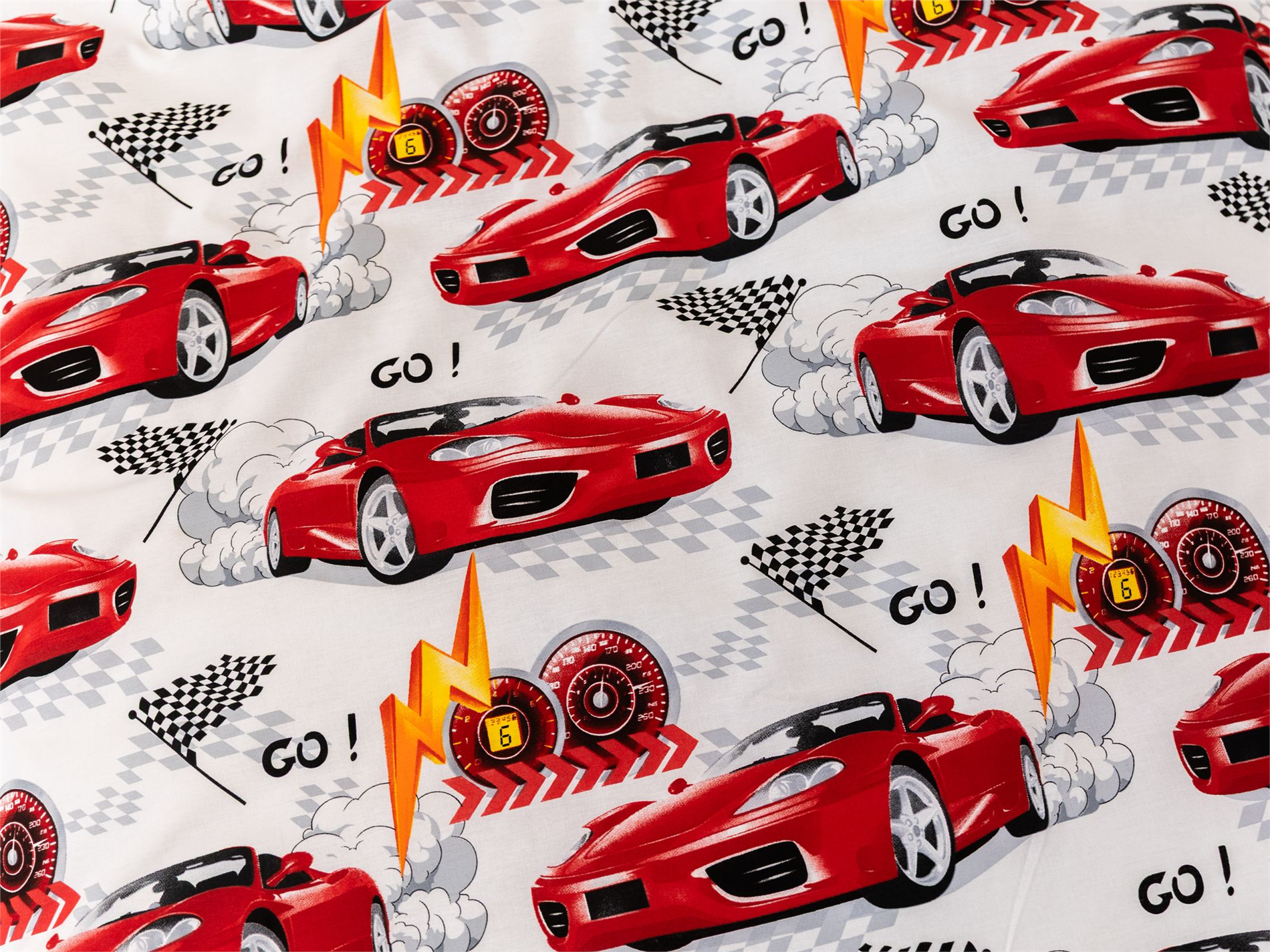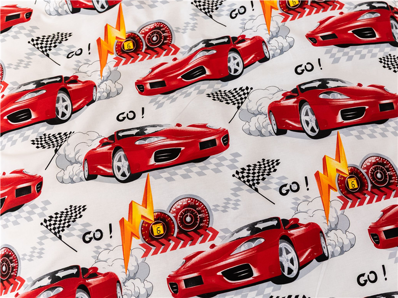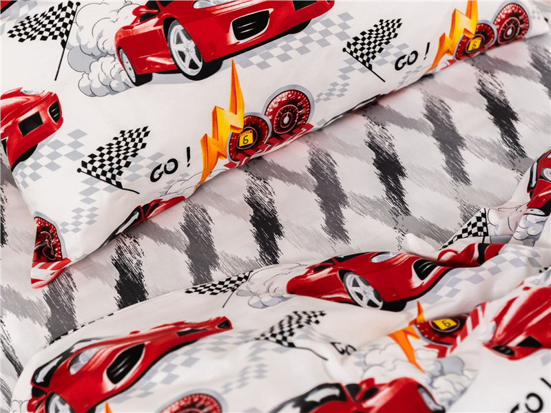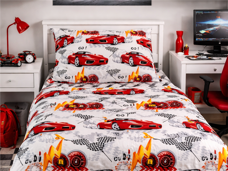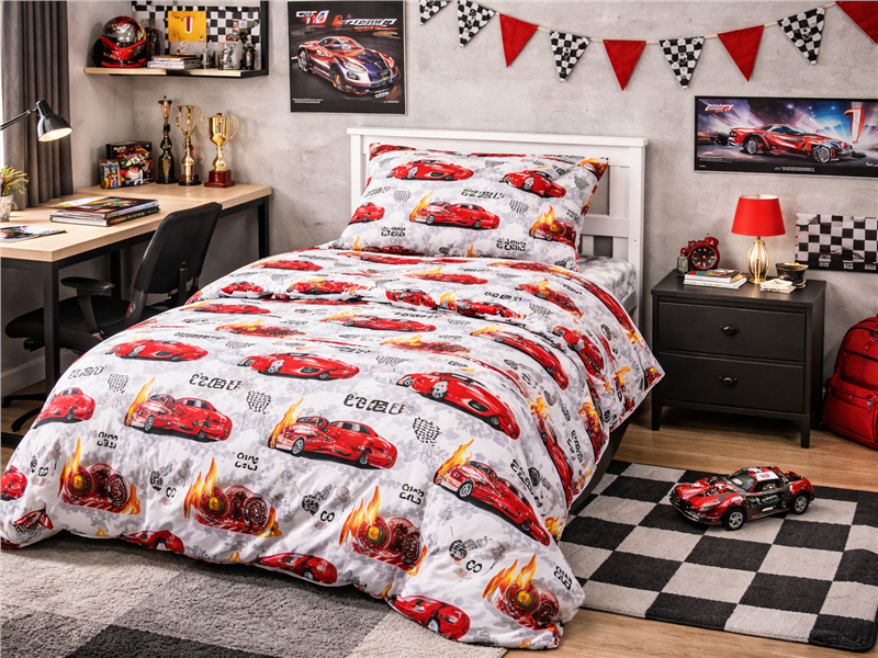 Динамичный принт с мощными спортивными автомобилями, флагами финиша и огненными акцентами создаёт атмосферу настоящих гонок прямо в комнате.