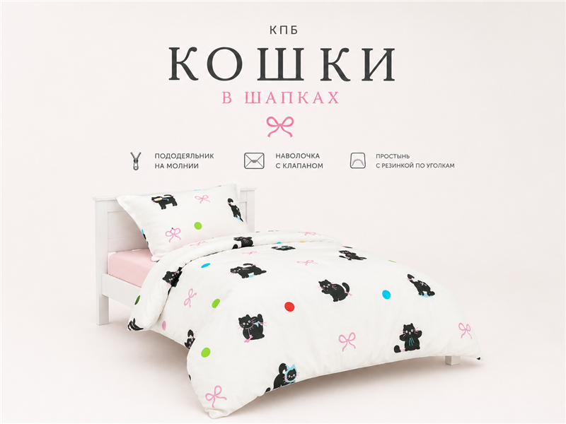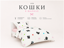 Комплект «Кошки в Шапках» создан для детей, которые любят милых животных, яркие детали и уютную красоту. Очаровательные чёрные котики в забавных шапочках на светлом фоне смотрятся стильно, весело и очень трогательно. Такой комплект мгновенно оживляет детскую комнату и делает кровать любимым местом отдыха.