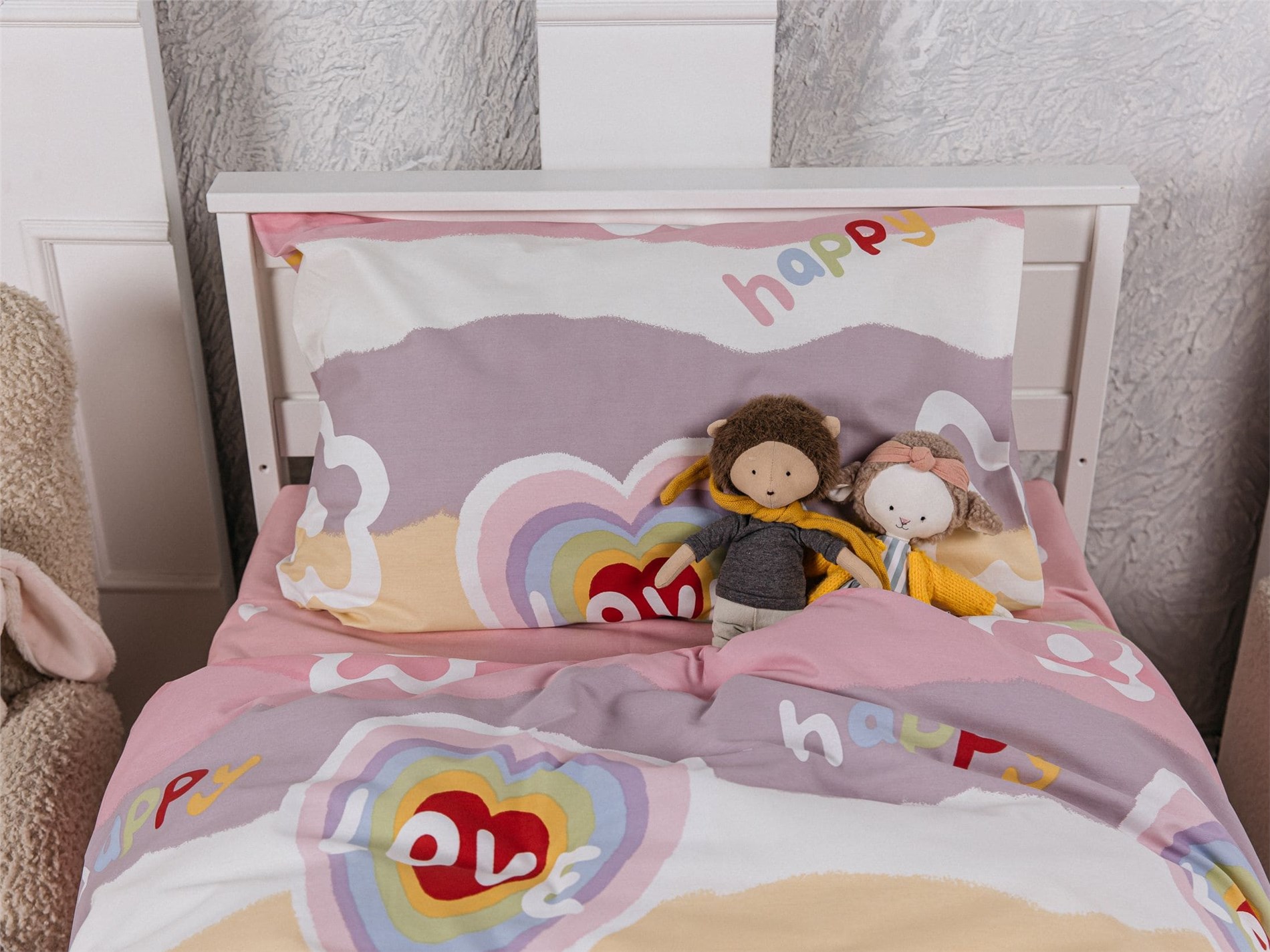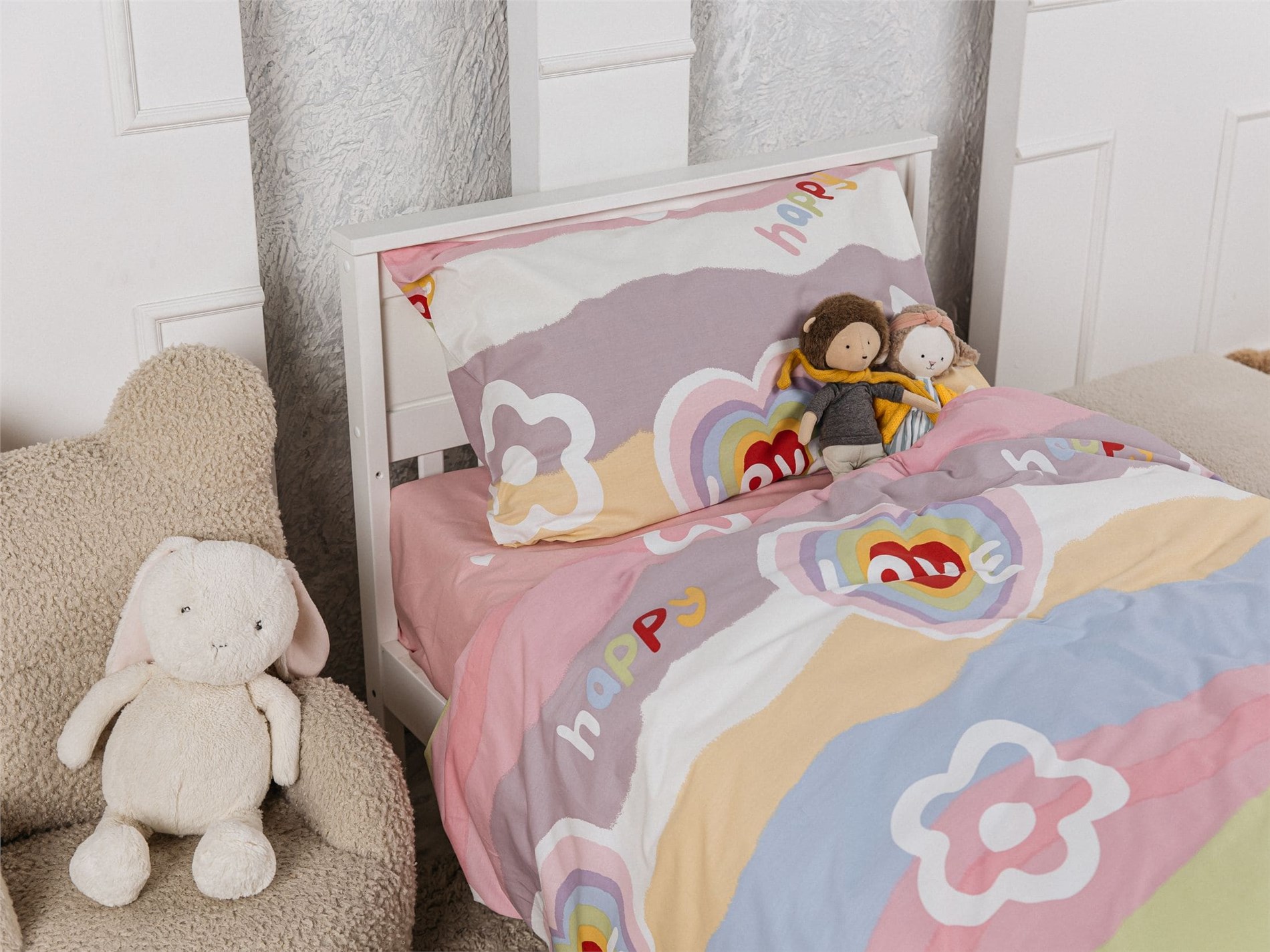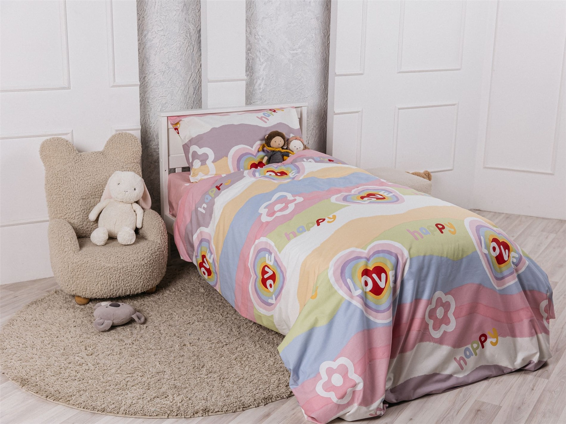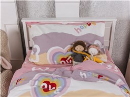 Погрузите ребёнка в атмосферу нежности, уюта и сказки! Комплект постельного белья «Happy Love» создан специально для девочек, которые любят всё яркое, доброе и волшебное. Радужные сердечки, милые надписи и пастельные облака на мягком сатине подарят уют и отличное настроение с первых минут сна.