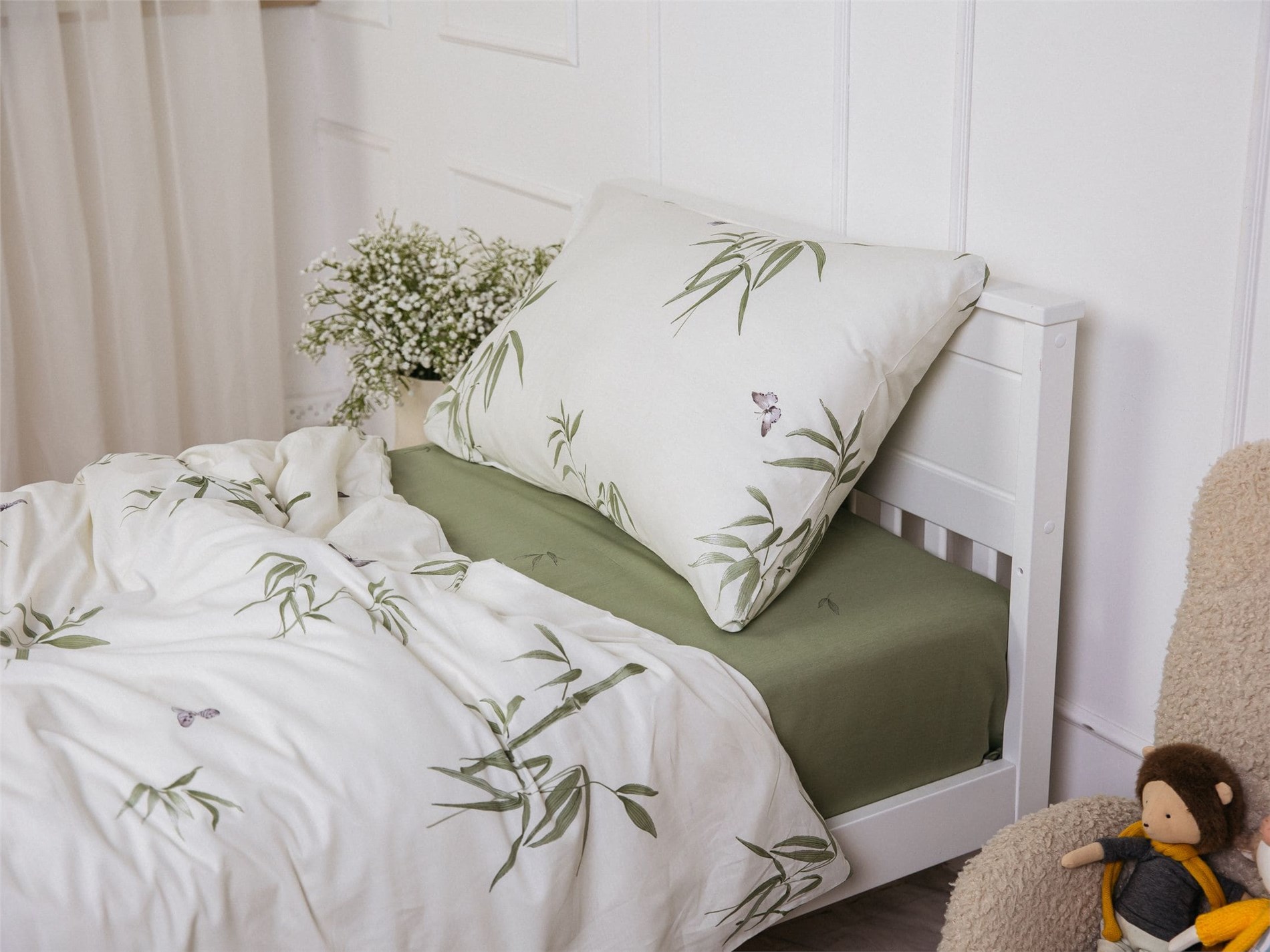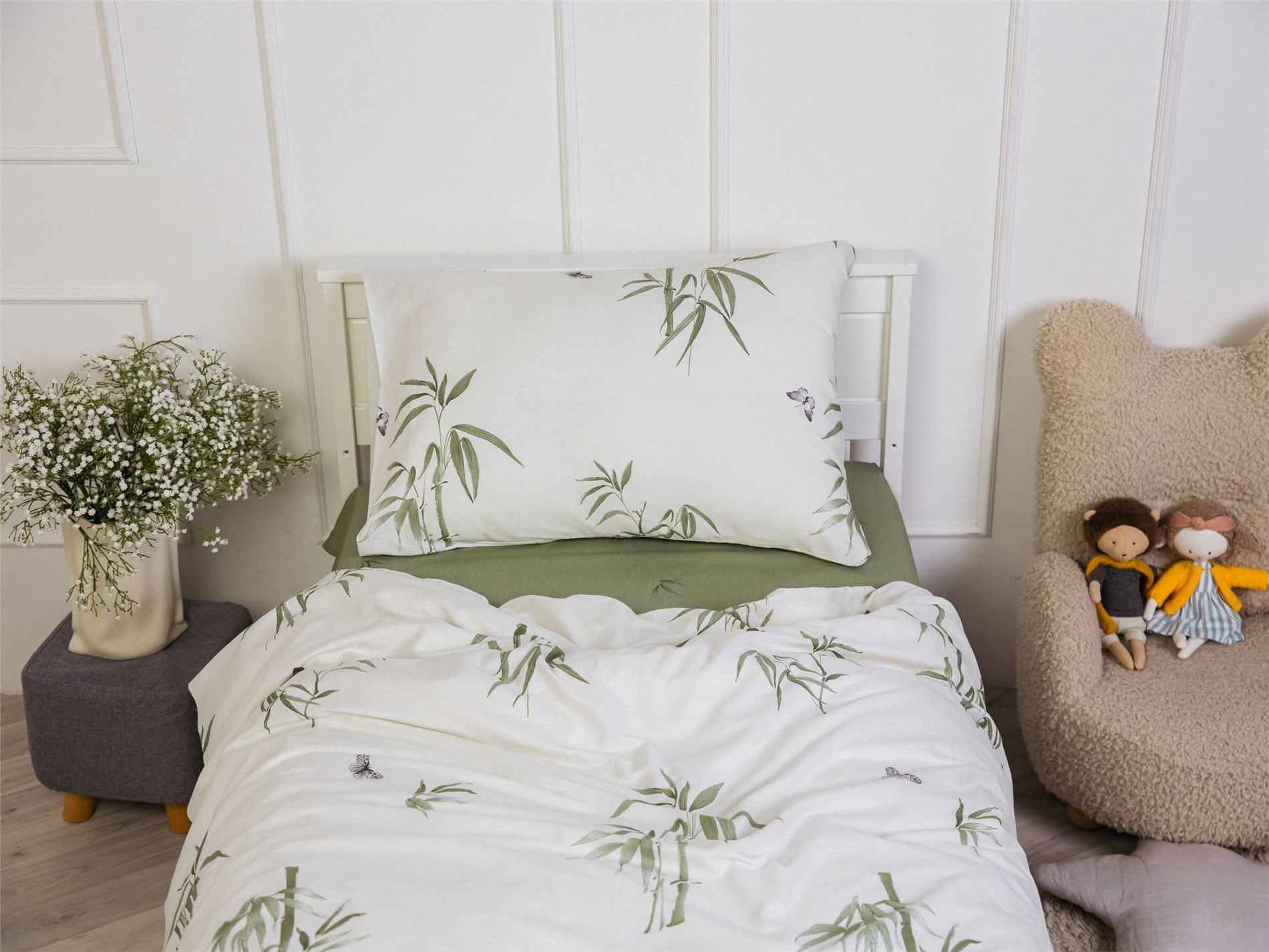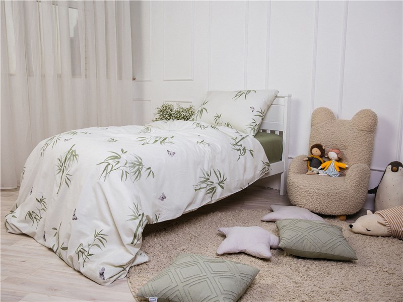Мягкие оттенки белого и зелёного с изящным рисунком бамбуковых ветвей и порхающих бабочек наполняют комнату ощущением свежего утра и естественной гармонии.