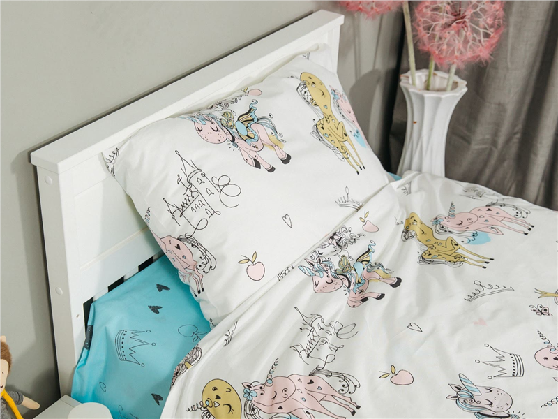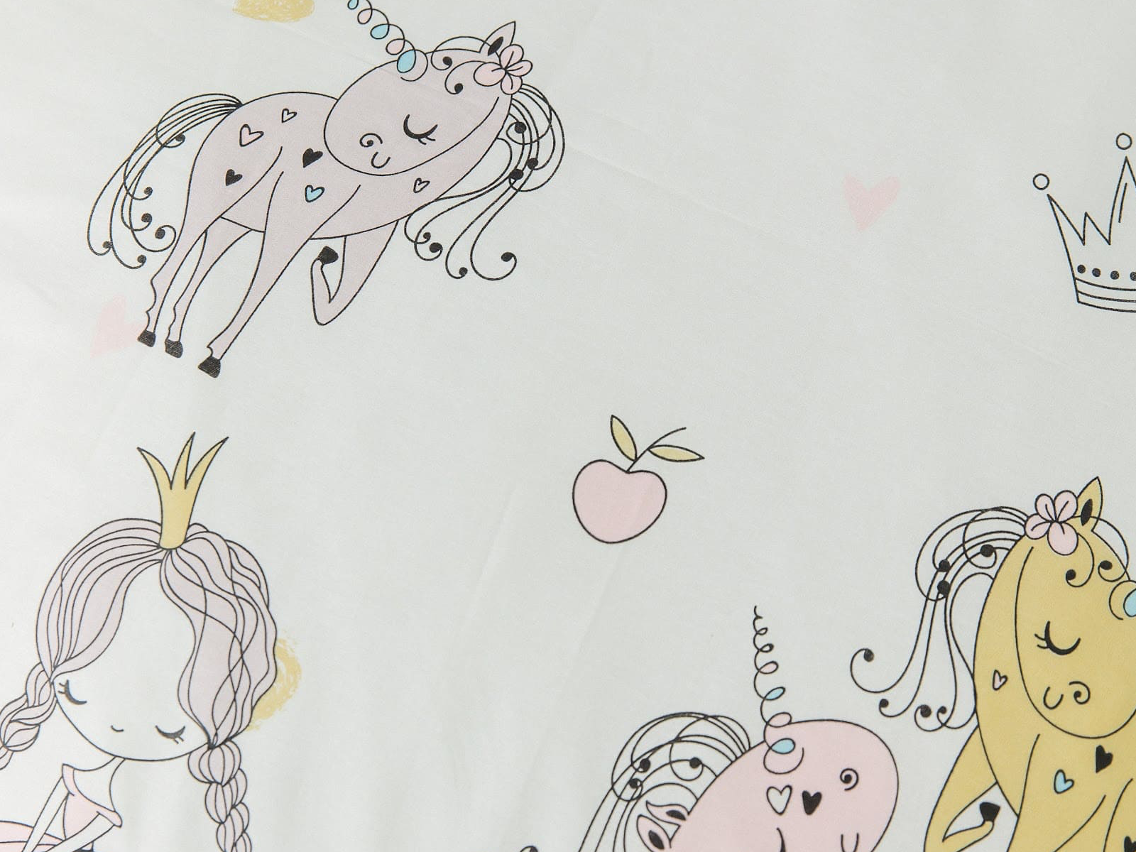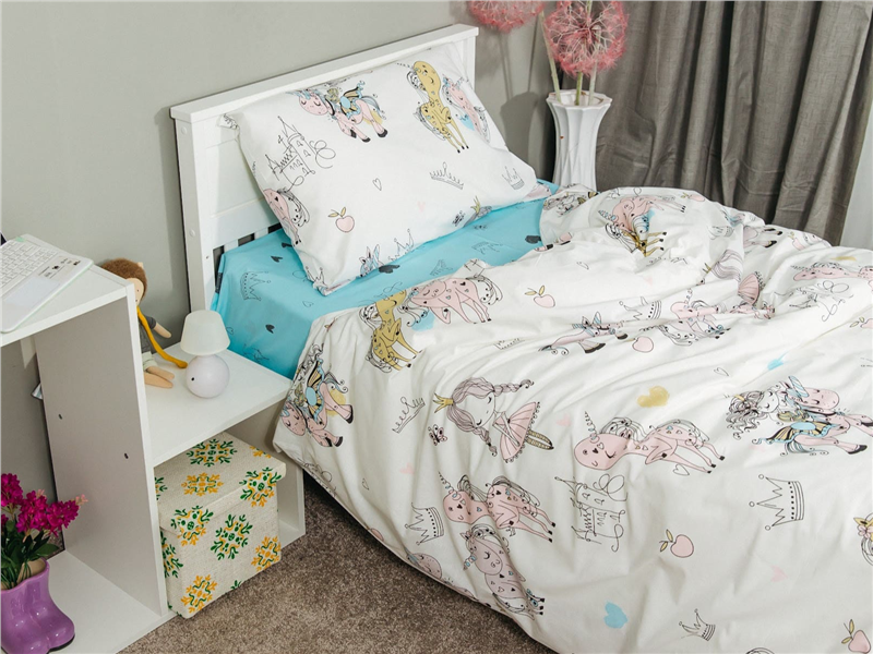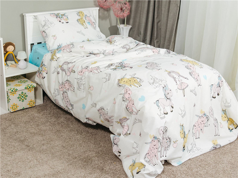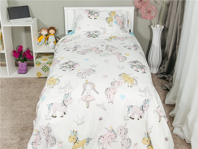 Мягкое и лёгкое постельное бельё из натурального поплина с очаровательными единорогами и принцессами. Идеально для спокойного сна и волшебных снов.