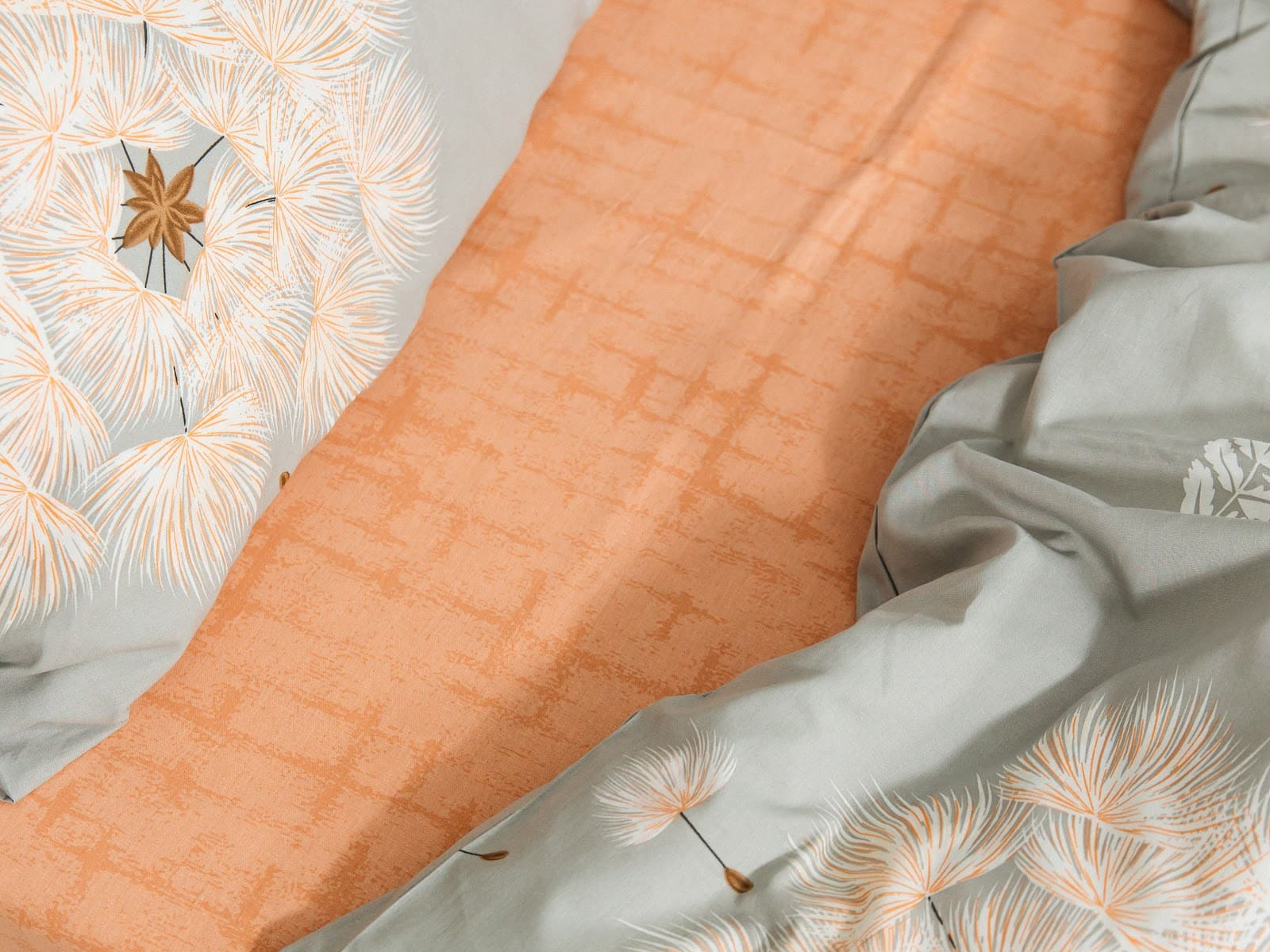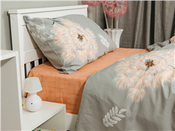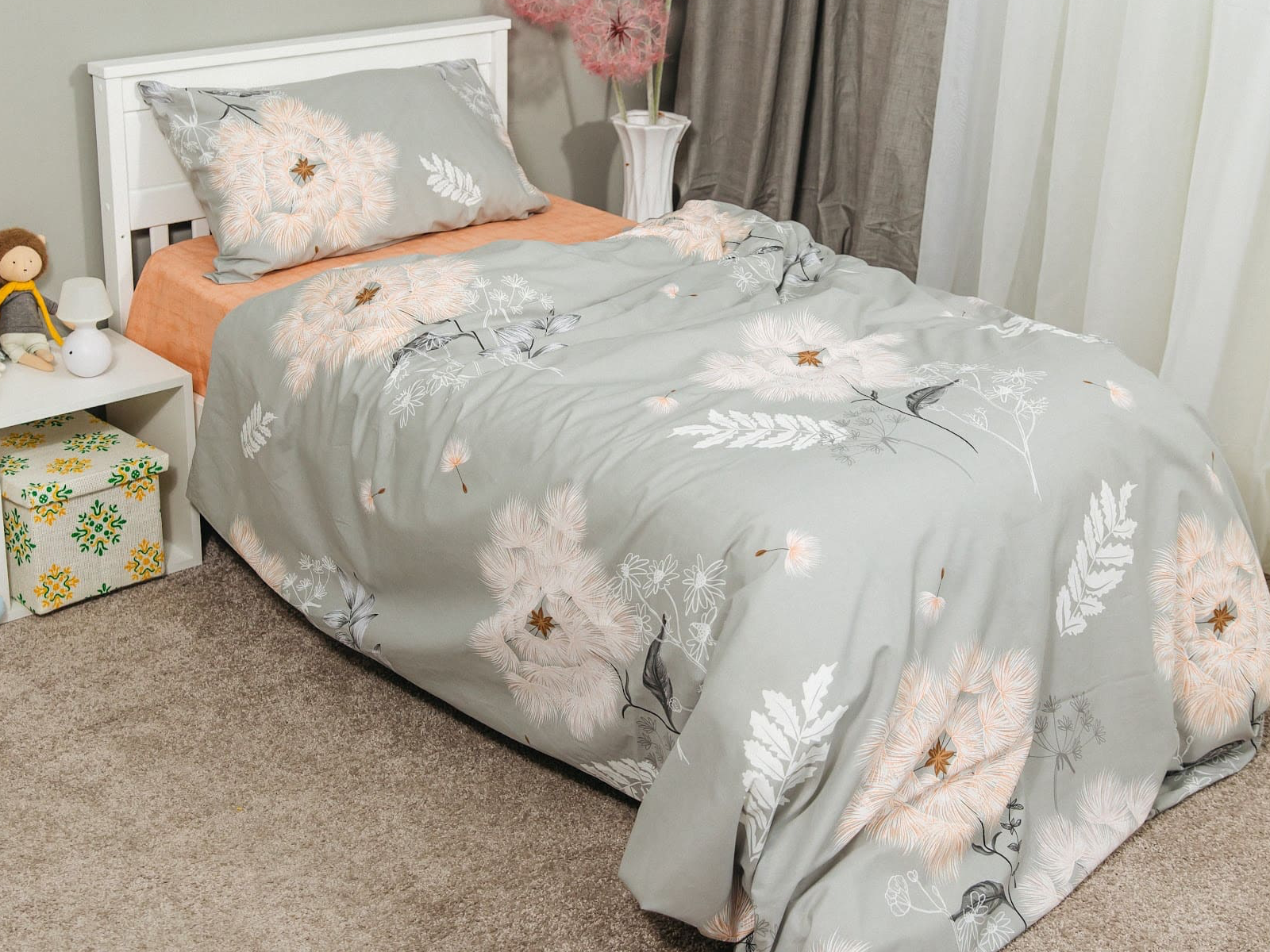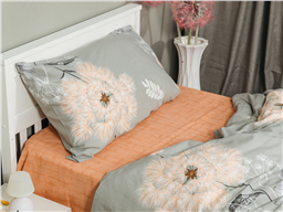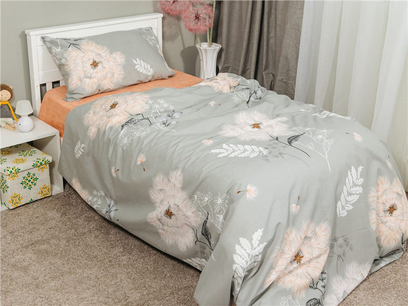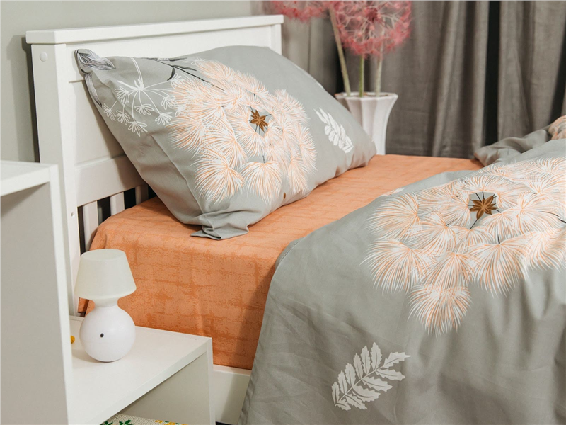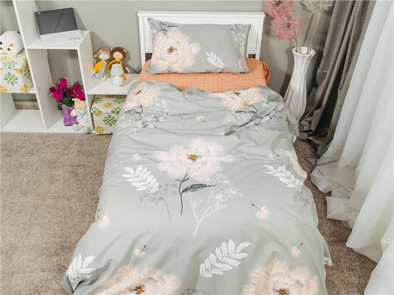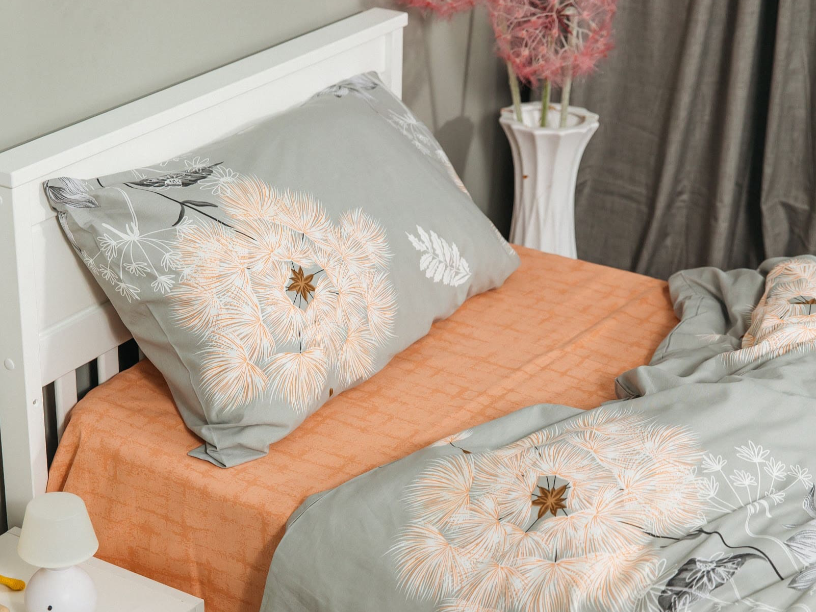 Комплект “Dandelion Whisper” создан для тех, кто ценит спокойствие и эстетику. На мягком фоне оттенка серого шалфея распускаются лёгкие одуванчики, папоротники и полевые цветы, будто колышущиеся на ветру. Тёплая терракотовая простыня придаёт интерьеру уют и изысканную теплоту.
