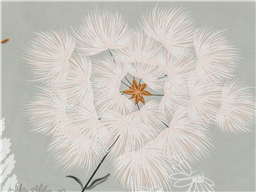 Лицевая сторона — изящные одуванчики и листья в бело-персиковой гамме.